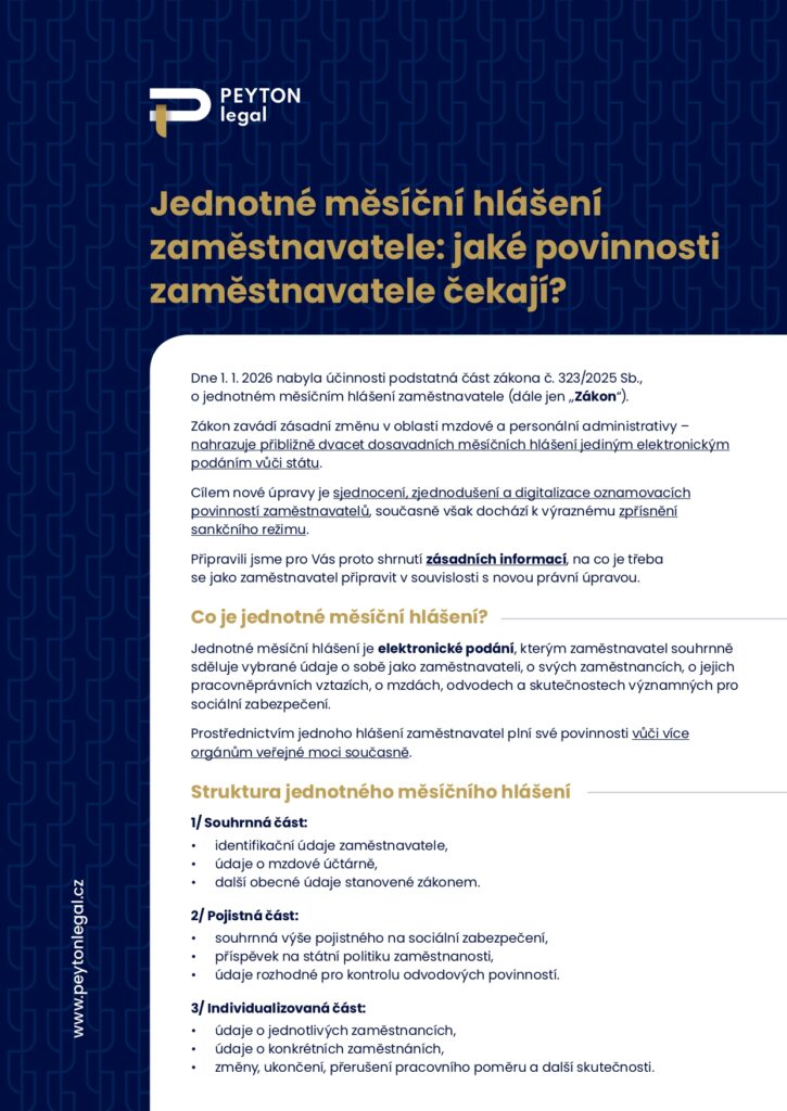 Kolegové pro Vás proto připravili přehled základních informací a praktických doporučení k jednotnému měsíčnímu hlášení zaměstnavatele, ve kterém se mimo jiné dozvíte, co je jednotné měsíční hlášení a jaké má náležitosti, jaké údaje jsou zaměstnavatelé povinni vykazovat, v jakých lhůtách a jakým způsobem se hlášení podává, jaké nové evidenční povinnosti zákon zavádí a jaké sankce mohou hrozit při porušení zákonných povinností.