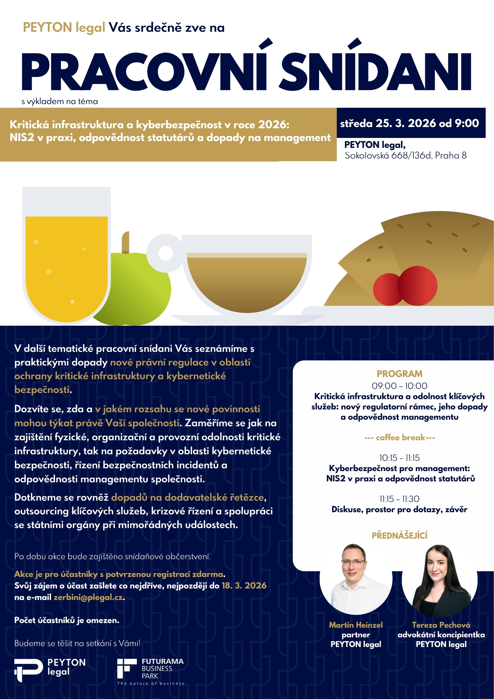 Dovolujeme si Vás touto cestou pozvat na pracovní snídani pořádanou PEYTON legal advokátní kancelář s.r.o., která se bude věnovat tématu: Kritická infrastruktura a kyberbezpečnost v roce 2026: NIS2 v praxi, odpovědnost statutárů a dopady na management.