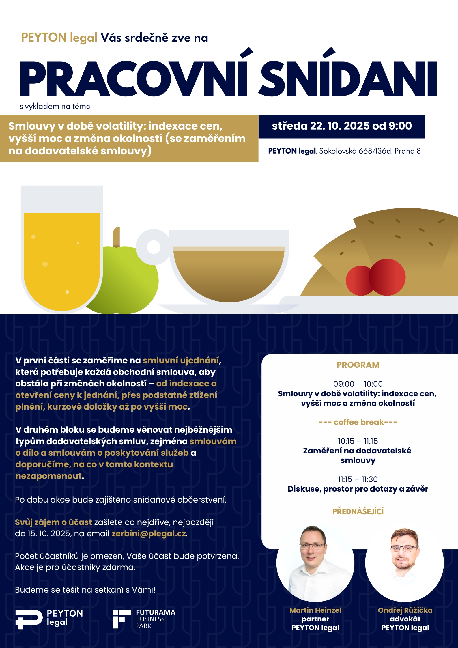 Dovolujeme si Vás touto cestou pozvat na pracovní snídani pořádanou PEYTON legal advokátní kancelář s.r.o., tentokrát s výkladem na téma: Smlouvy v době volatility: indexace cen, vyšší moc a změna okolností se zaměřením na dodavatelské smlouvy (zejm. smlouvy o dílo a smlouvy o službách).